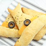 Place the triangles on an ungreased baking sheet ( I like using a silicon baking mat.) Brush the triangles with melted butter, then sprinkle with garlic powder and dried parsley. Fold the straight end of each triangle over to resemble the brim of the witch hat.